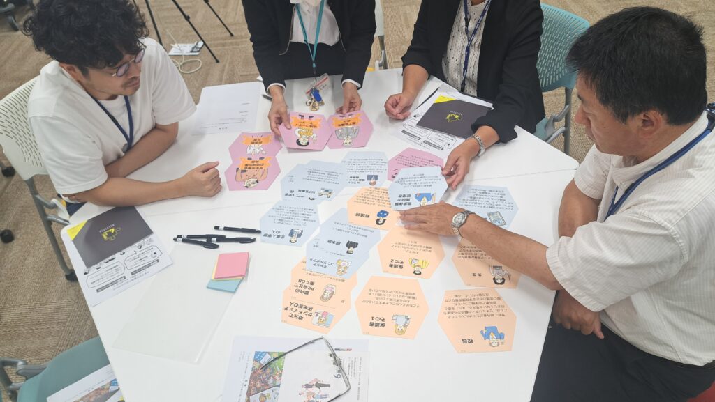 プレイの振り返りのあと、地方自治や市民の役割についての講義を経て、後半のワーク。カードに書かれた市民の意見や情報を整理しながら、「この意見はいいな」、「でもこっちに反対意見があるな」、といった形で、講義でのポイントも念頭に置いて対話を進め、提案を組み立てていきました。